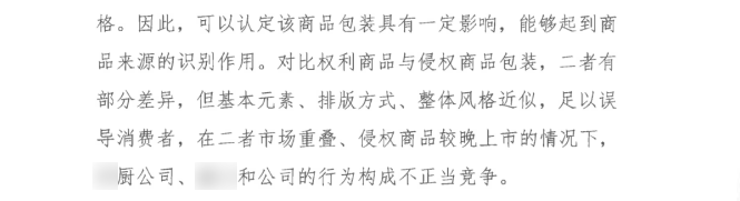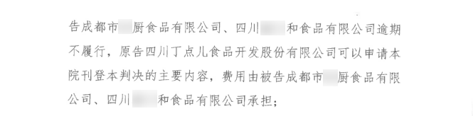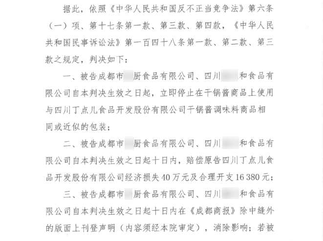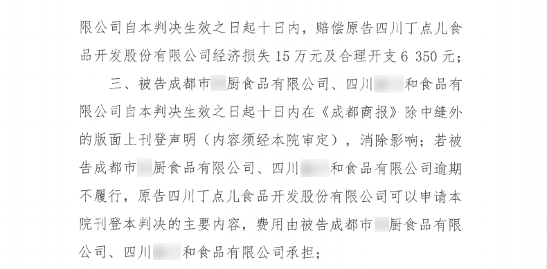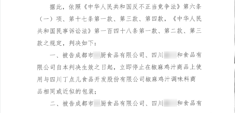 ? ? ? ?2020年11月30日,成都市中級人民法院一審判決丁點(diǎn)兒股份訴成都市某廚食品有限公司、四川某和食品有限公司不正當(dāng)競爭維權(quán)案勝訴。