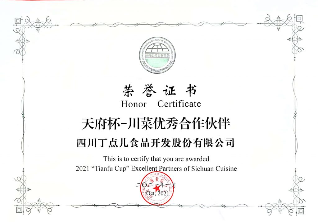 ? ? ? ?10月18-20日,由成都市郫都區(qū)人民政府、世界中餐業(yè)聯(lián)合會(huì)共同主辦的第四屆世界川菜大會(huì)在成都市郫都區(qū)隆重召開,丁點(diǎn)兒股份攜企業(yè)明星產(chǎn)品在會(huì)場(chǎng)亮相,并在2021“天府杯”世界川菜頒獎(jiǎng)大會(huì)中獲得“‘天府杯’川菜優(yōu)秀合作伙伴”稱號(hào)。