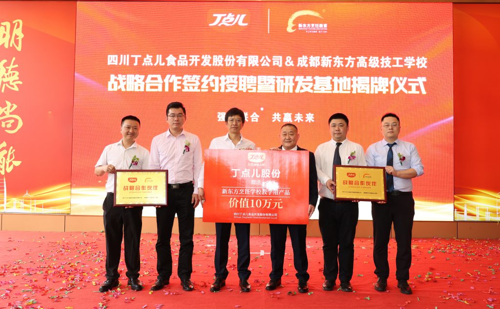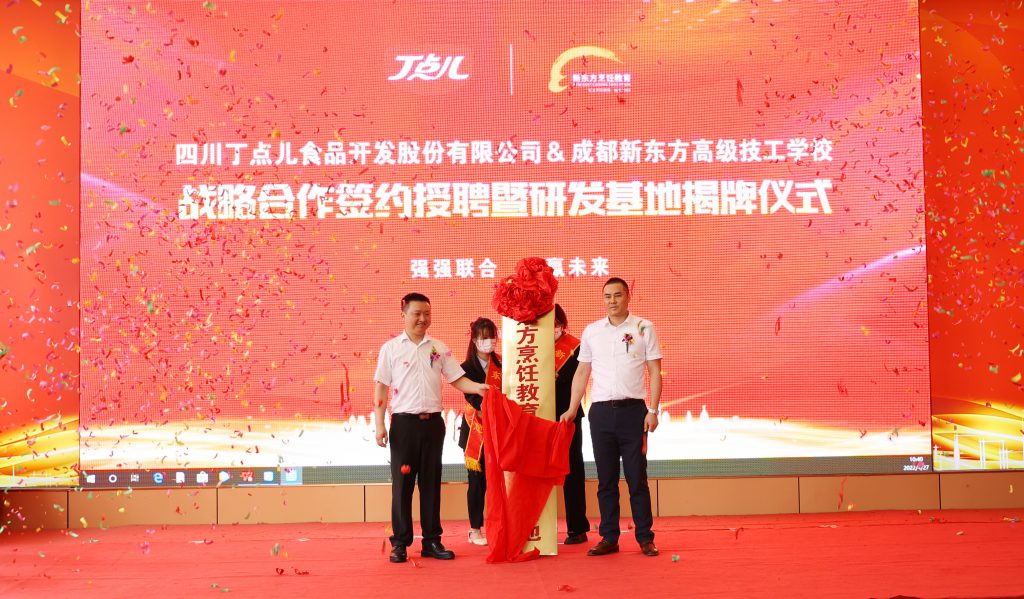 ? ? ? ? 為進一步深化產教融合,加強校企合作,推動人才培養(yǎng)模式變革,4月27日上午,四川丁點兒食品開發(fā)股份有限公司與成都新東方高級技工學校戰(zhàn)略合作簽約暨授聘儀式、研發(fā)基地揭牌儀式在成都新東方烹飪學校隆重舉行。