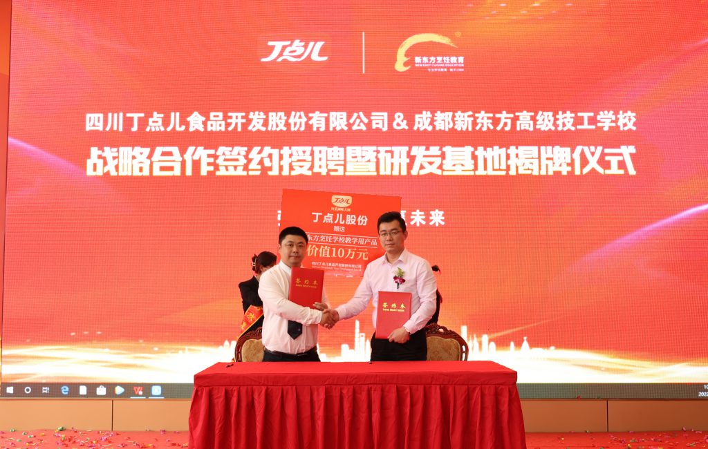 ? ? ? ? 在與會相關領導及師生共同見證下,四川丁點兒食品開發(fā)股份有限公司市場總監(jiān)劉振平代表丁點兒股份與成都新東方高級技工學校正式簽署合作協(xié)議,并向成都新東方烹飪學校贈送價值10萬元的教學用產品。