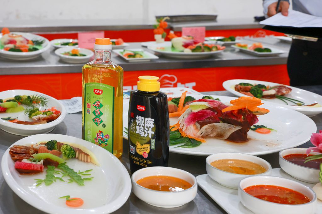比賽中,選手們各顯神通,紛紛拿出自己的看家本領(lǐng)爭取拔得頭籌。丁點兒麻得到紅花椒油、藤椒油、干鍋醬、椒麻雞汁、金湯酸菜醬等高品質(zhì)特色川調(diào)助力選手烹飪出一道道色香味俱全的菜品,讓人贊不絕口。
