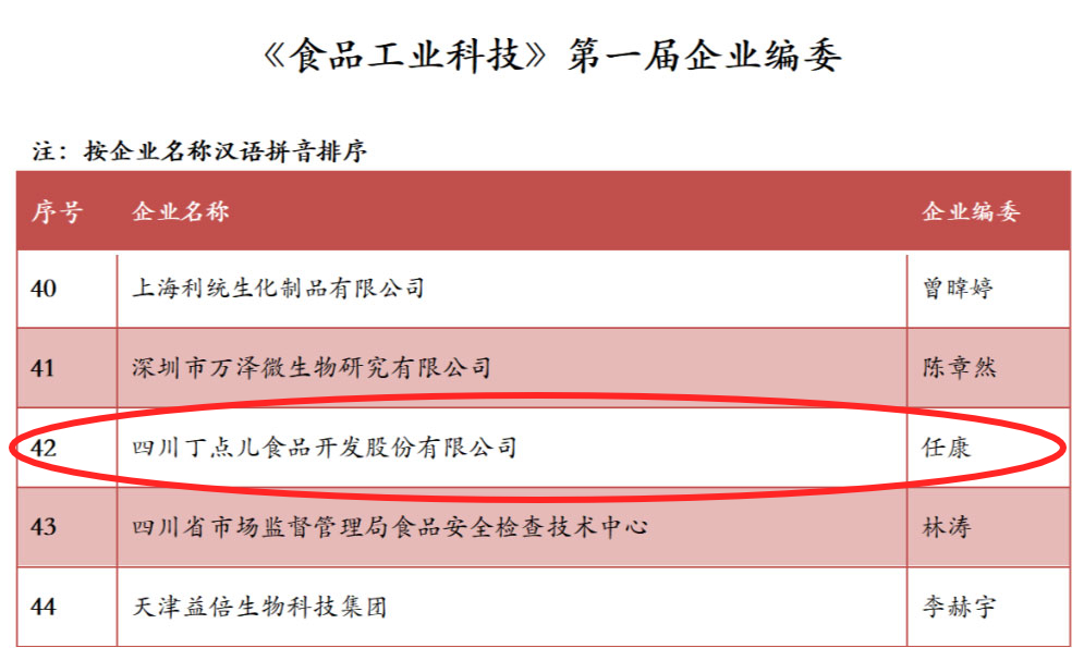 近日,中國權(quán)威學(xué)術(shù)期刊《食品工業(yè)科技》第一屆企業(yè)編委專家名單公布,四川丁點兒食品開發(fā)股份有限公司董事長任康成功當(dāng)選。
