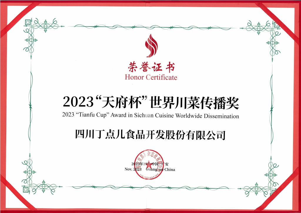 憑借出色的企業(yè)影響力和巨大的發(fā)展?jié)摿?,丁點(diǎn)兒食品在這一年又?jǐn)孬@了多項(xiàng)榮譽(yù)?!澳甓瘸?jí)品牌之星”、2023“天府杯”世界川菜傳播獎(jiǎng)、第十一屆中國食材電商節(jié)-優(yōu)質(zhì)企業(yè)推薦等稱號(hào),充分展示了行業(yè)對丁點(diǎn)兒食品實(shí)力的肯定。