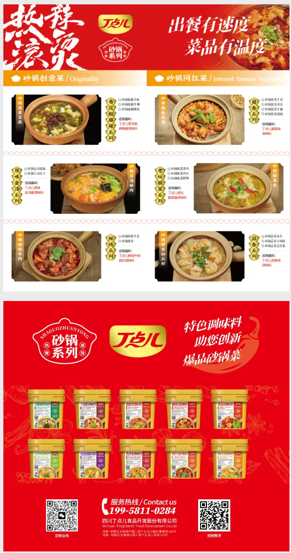 出餐有速度,菜品有溫度。熱辣滾燙的砂鍋菜作為近年來的餐飲新風(fēng)口,自帶“紅氣”。本次丁點兒食品以砂鍋菜為切入點,創(chuàng)新推出砂鍋菜系列十余款標(biāo)準(zhǔn)化特色調(diào)味料,口味覆蓋醬香、咸鮮、麻辣、香辣、酸辣、金湯等多種味型,力求滿足食客就餐新體驗的同時,又能有效實現(xiàn)門店拓品出新。