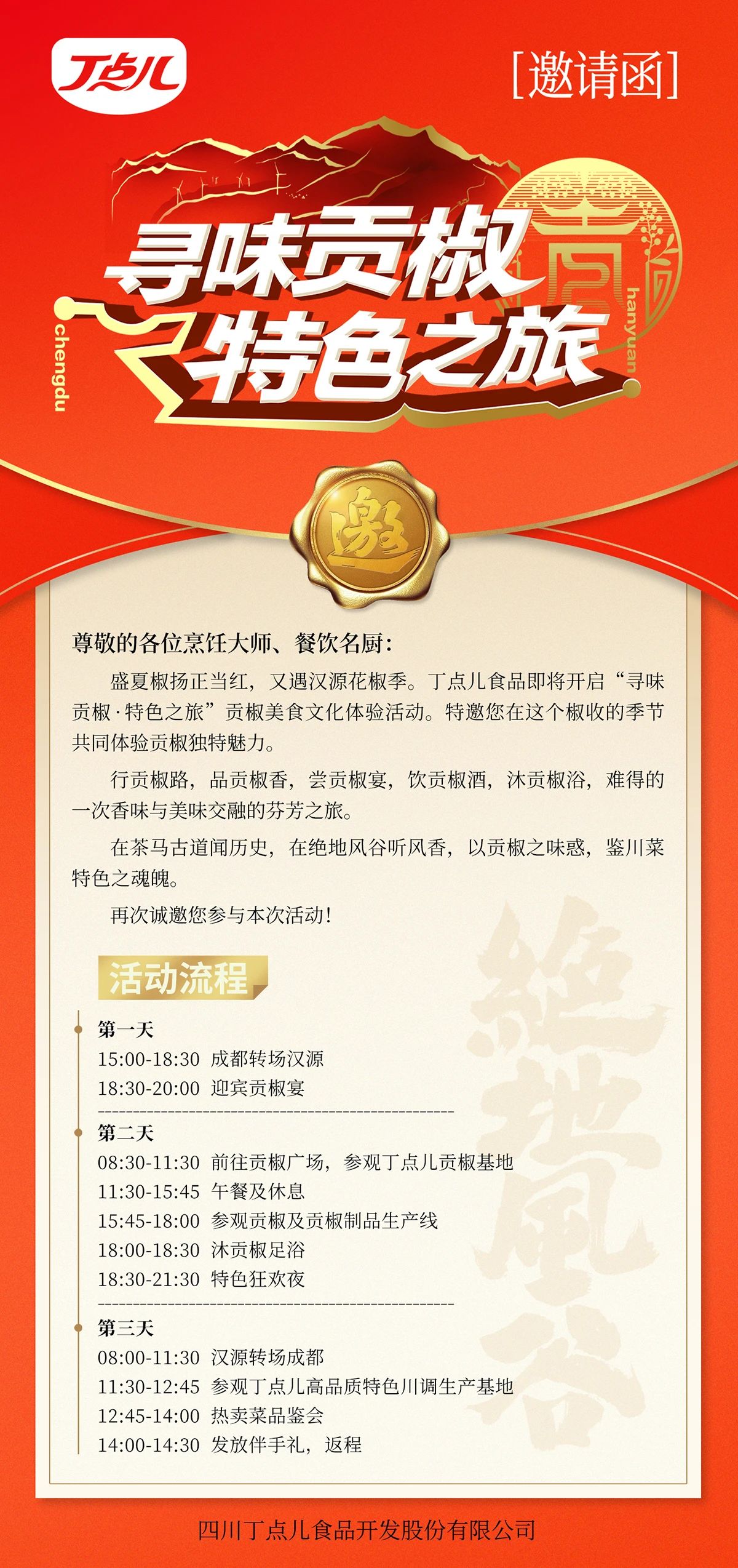 8月至9月中旬,丁點兒食品誠邀全國各地餐飲烹飪大師、名廚和餐飲老板參與2024“尋味貢椒·特色之旅”營銷體驗活動,我們在“川菜之城”郫都,“貢椒之鄉(xiāng)”漢源等著您!我們將持續(xù)報道,敬請關(guān)注。