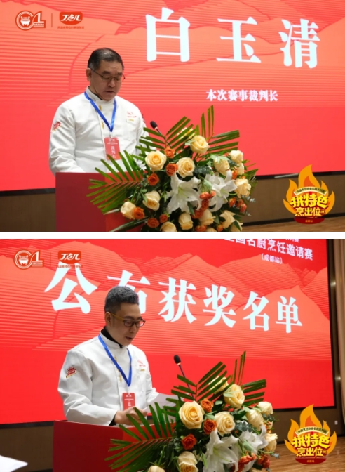 中國烹飪協(xié)會名廚專委會常務(wù)副主席、本次大賽裁判長白玉清作了賽事點評;中國烹飪協(xié)會名廚專委會常務(wù)副主席、四川旅游學(xué)院教授、本次大賽監(jiān)審長蘭明路宣讀了金獎前十名名單。