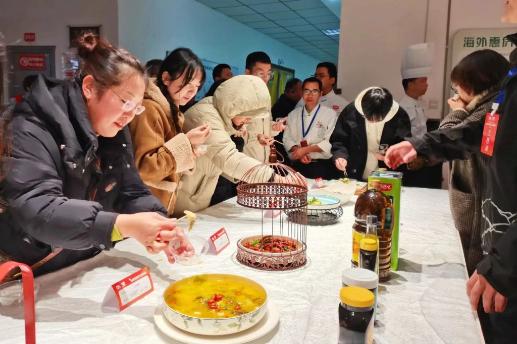 獨特的風(fēng)味、卓越的品質(zhì),丁點兒高品質(zhì)特色川調(diào)產(chǎn)品吸引了眾多參賽選手及現(xiàn)場嘉賓的目光。以其烹飪的干鍋醬香掌中寶、青椒毛血旺、金湯酸菜魚片等菜品更是香飄四溢,一上桌就被品鑒一空?!疤贸粤?,不夠吃,不盡興!”四川旅游學(xué)院一位志愿者同學(xué)說。