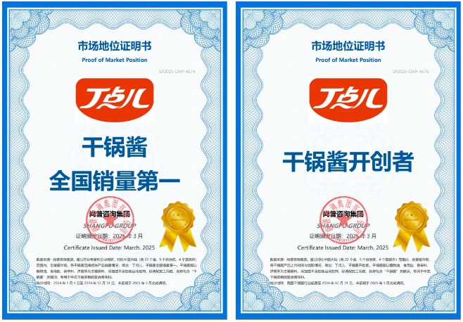 尚普咨詢集團(tuán)是中國最早成立的專業(yè)市場研究公司之一。其通過行業(yè)專家和企業(yè)調(diào)研,對比中國大陸(含22個省、5個自治區(qū)、4個直轄市)范圍內(nèi),全渠道市場、各干鍋醬產(chǎn)品上市時間與創(chuàng)新情況,從我國干鍋醬行業(yè)起源統(tǒng)計至2024年12月31日,得出丁點兒為“干鍋醬開創(chuàng)者”的認(rèn)證。同時根據(jù)全渠道市場,統(tǒng)計了2024年1月1日至2024年12月31日各干鍋醬品牌相關(guān)產(chǎn)品銷量情況,得出丁點兒“干鍋醬全國銷量第一”的認(rèn)證。