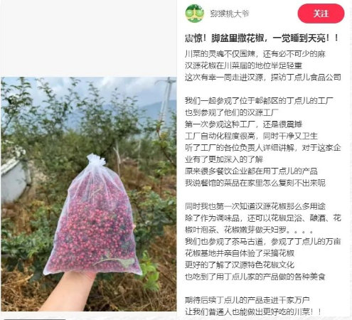中國(guó)川菜產(chǎn)業(yè)園關(guān)注園區(qū)企業(yè)發(fā)展,詳細(xì)記錄了丁點(diǎn)兒“尋味貢椒·特色之旅”活動(dòng),并將其融入園區(qū)發(fā)展之中;大美漢源則從產(chǎn)地角度出發(fā),講述了漢源貢椒與丁點(diǎn)兒食品攜手共進(jìn)的合作歷程。