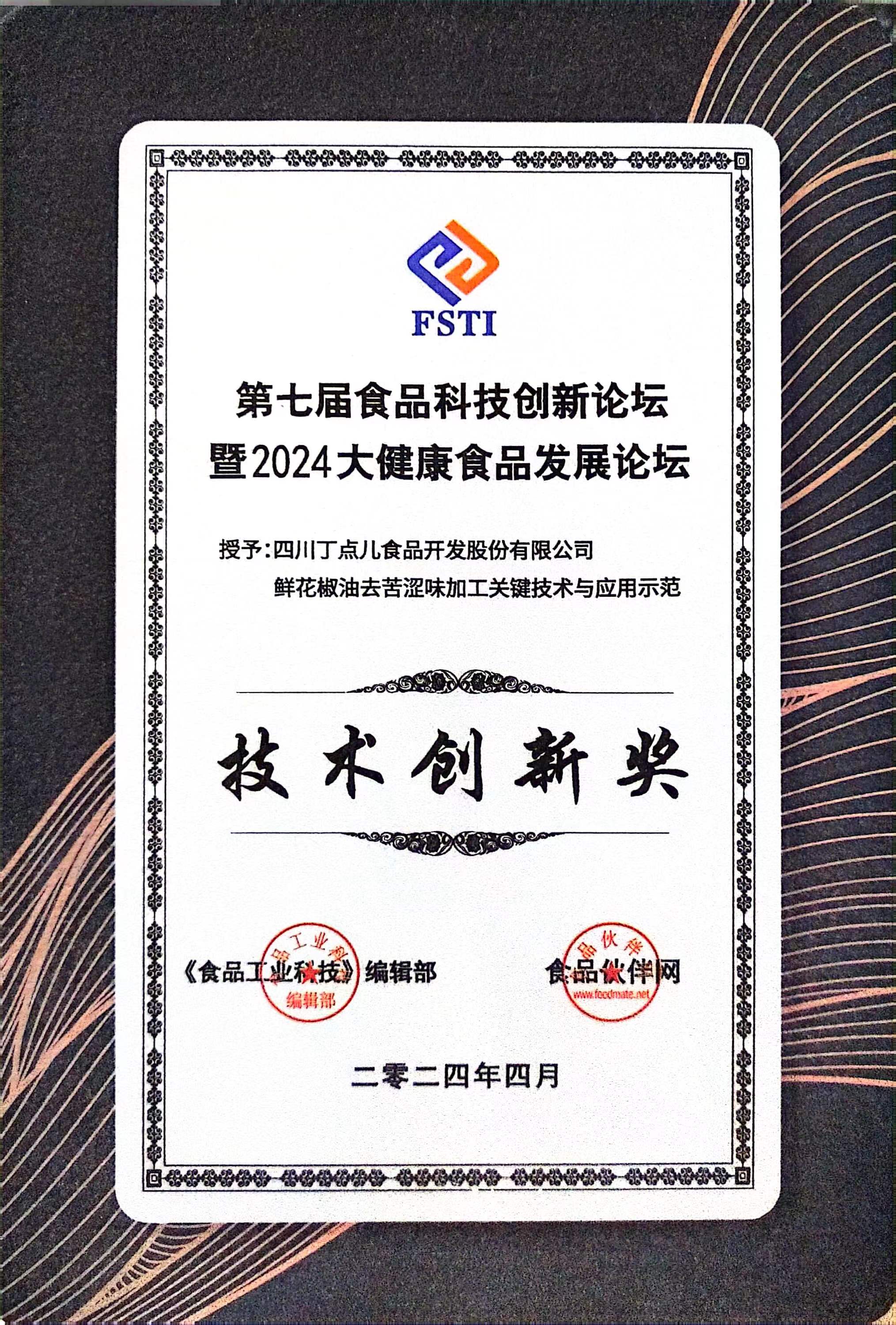 喜報(bào)!丁點(diǎn)兒食品“鮮花椒油去苦澀味關(guān)鍵技術(shù)”獲“技術(shù)創(chuàng)新獎(jiǎng)”!