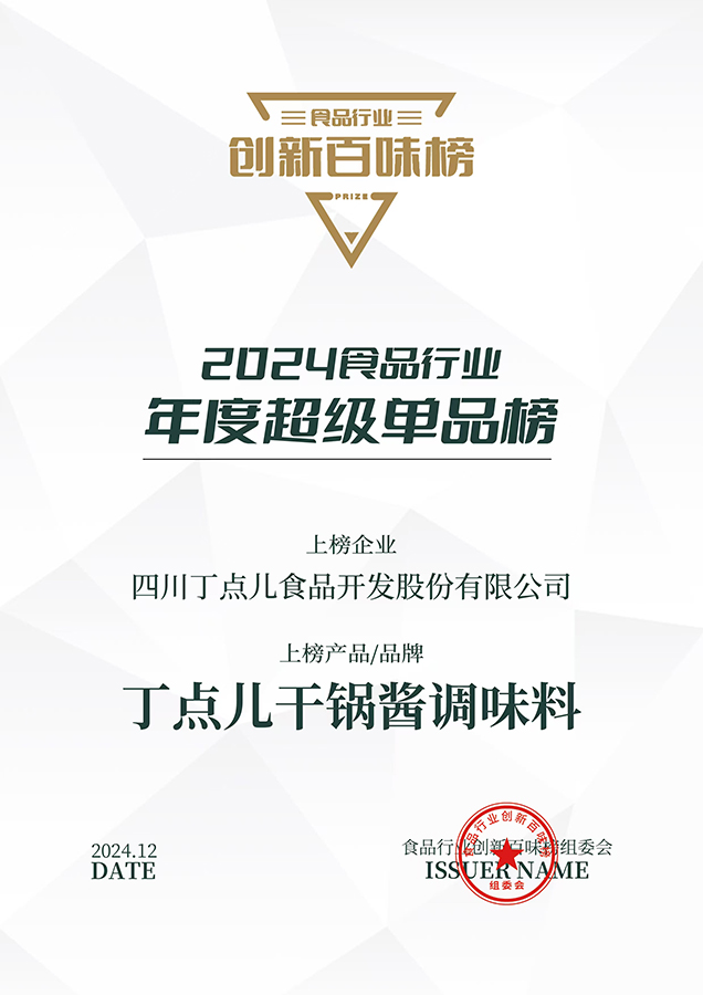 丁點(diǎn)兒干鍋醬獲“2024食品行業(yè)年度超級(jí)單品”獎(jiǎng)